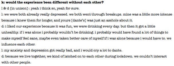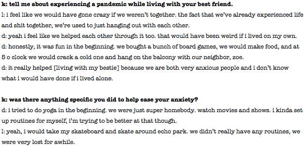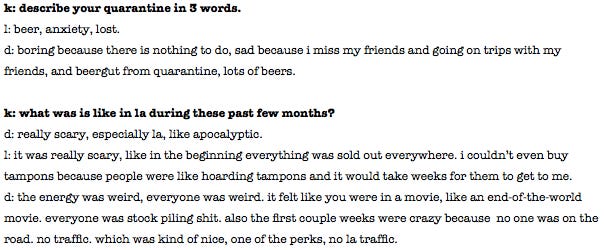 i chatted with my two very good friends, Lindsay and Dante, and asked them about there life during the past few months and what effects the quarantine had on them. lindsay and dante both live together with two cats and a puppy in los angeles.